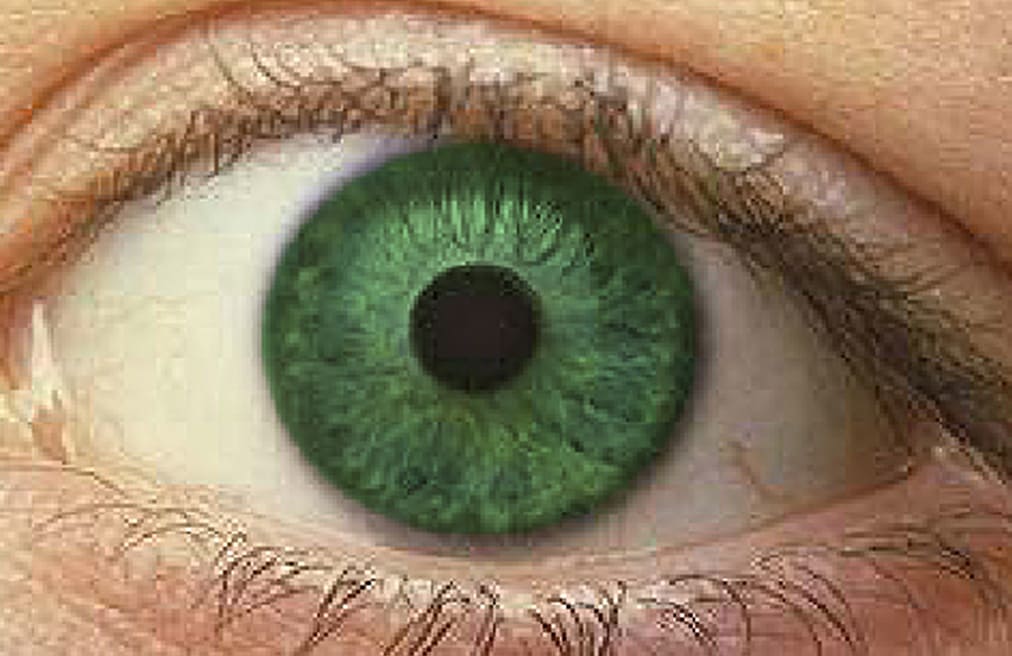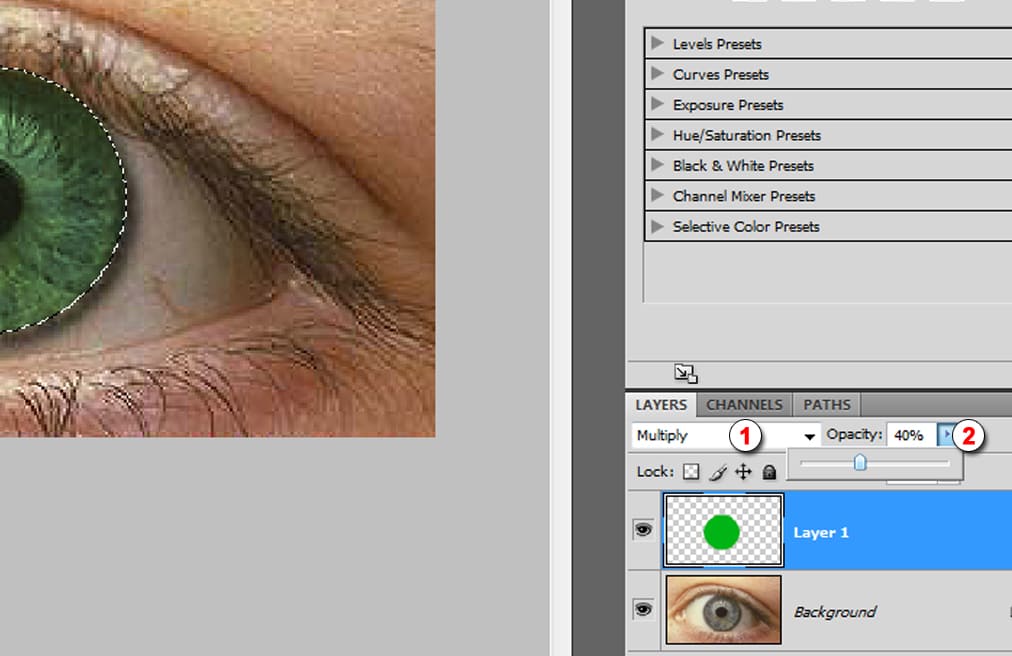 Выбираем инструмент Paint Bucket Tool (1) и щелкаем по центру выделения (2). Получился закрашенный глаз выбранным цветом.
