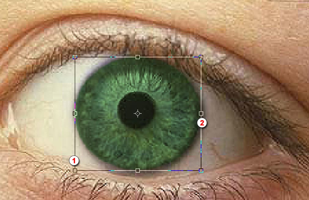В новом слое сделаем выделение кругом, используя инструмент Elliptical Marquee Tool (1). Подведем к центру зрачка и нажав на клавиатуре клавишу ALT будем вести мышкой от центра к краю, и тем самым у нас будет появляться выделение кругом (2). Сделаем по размеру примерно равное глазу, если будет чуть больше или чуть меньше не страшно, мы потом его отредактируем.