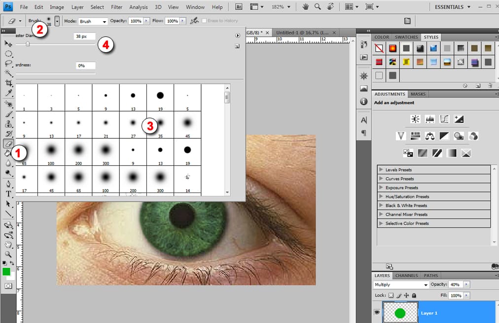 Теперь можно только для реалистичности взять резинку Eraser Tool (1) выбрать в настройках (2) мягкую резинку и размером по диаметру зрачка (3), и удалить наш цвет (4), тем самым мы вернем зрачку его естественный цвет.