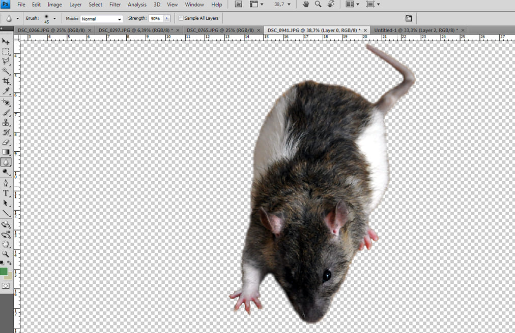 Потом переключимся на нашу фотографию с мышкой и нажмем меню Edit и там Paste. У нас появиться фон, теперь нам надо перетащить слой с фоном под слой с мышкой.
